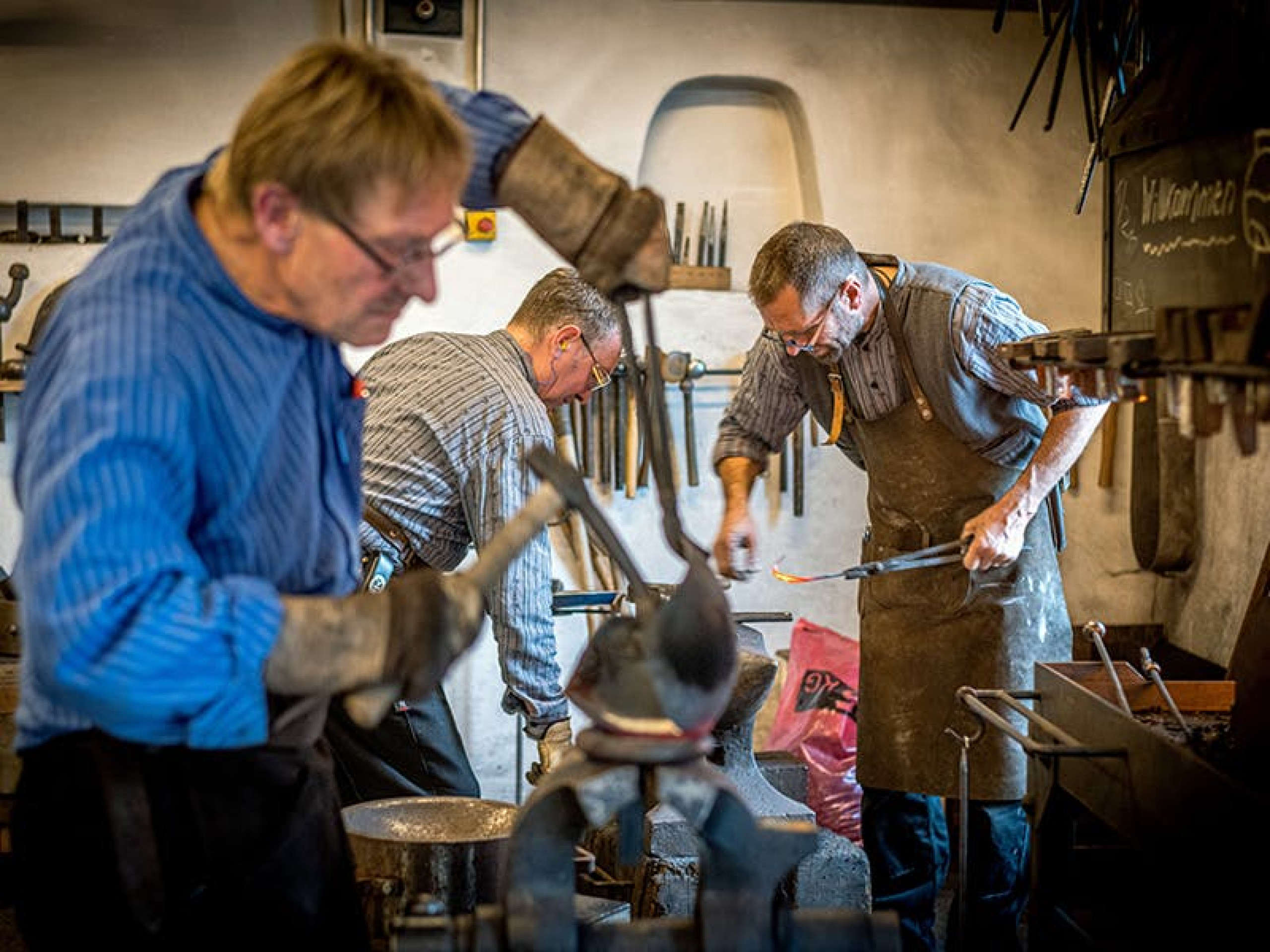 Für einen Tag tauchen wir in die faszinierende Welt des Schellenschmiedens ein. Du wählst aus einer Vielzahl kleinerer Rollen und Schellen, um dein eigenes Werk zu gestalten. Nun wird es heiss – unter dem rhythmischen Schlag des Hammers verformt sich das glühende Eisenblech, und allmählich nimmt dein Werk seine endgültige Form an.